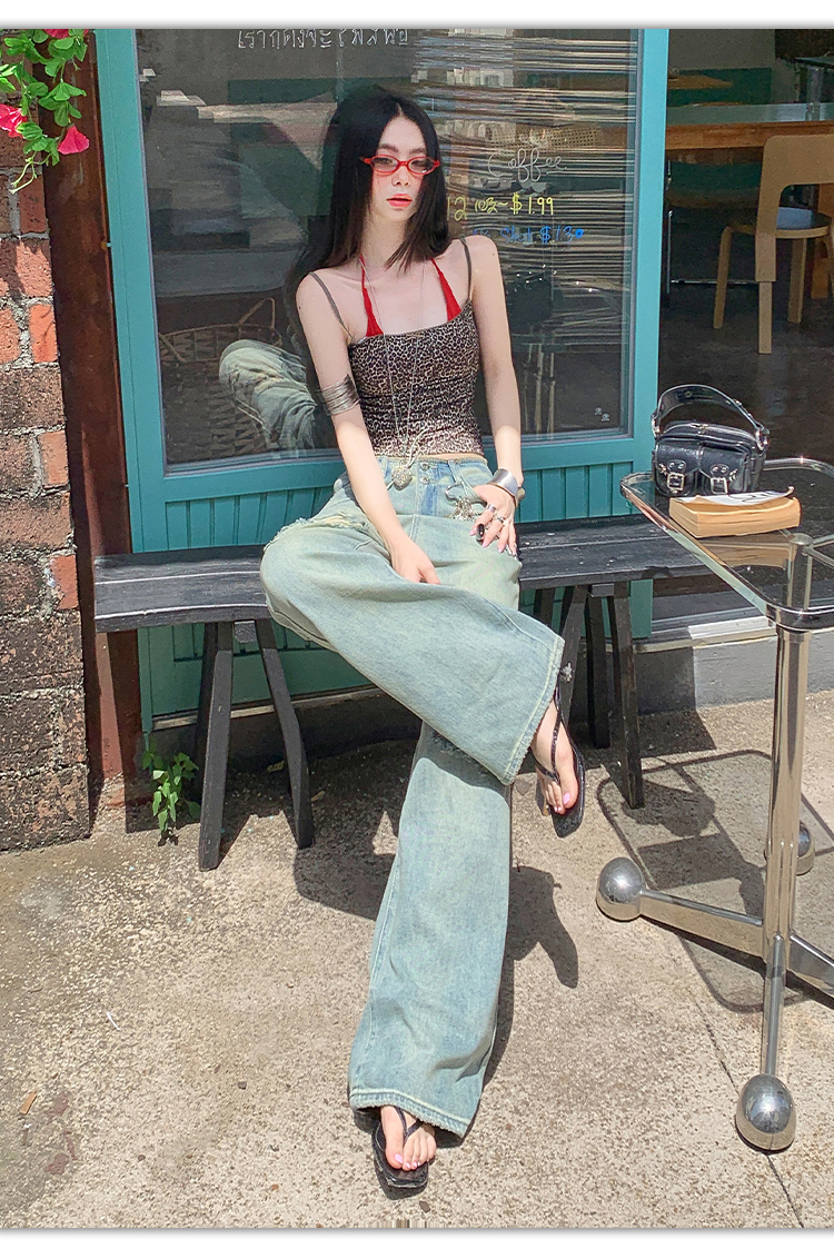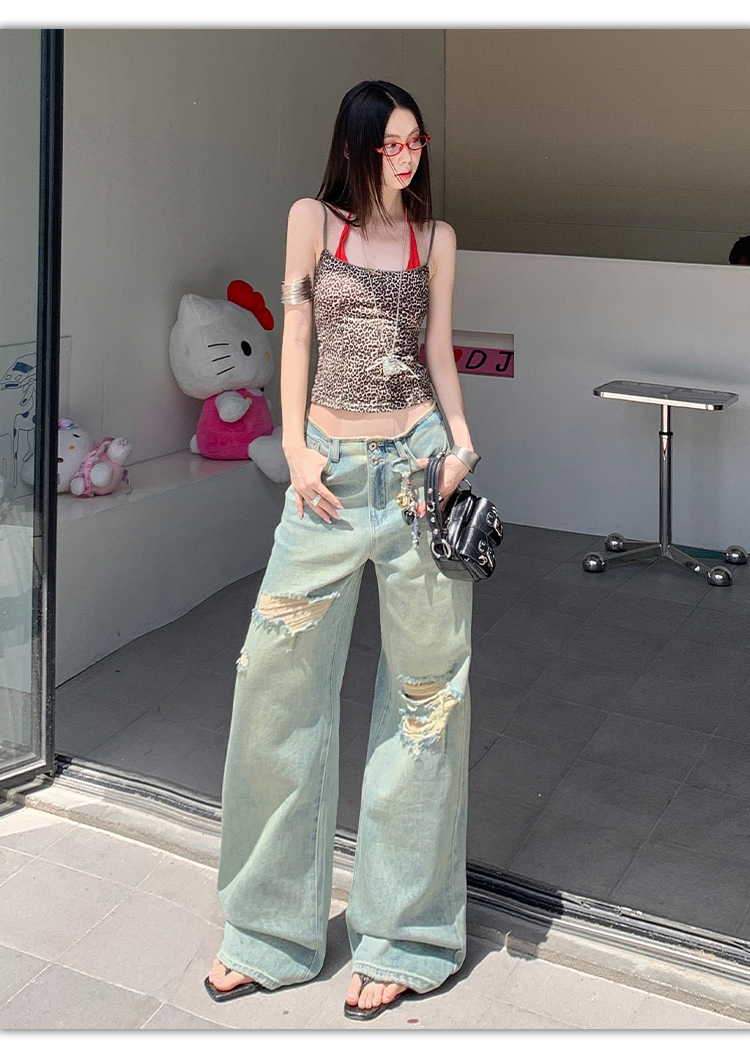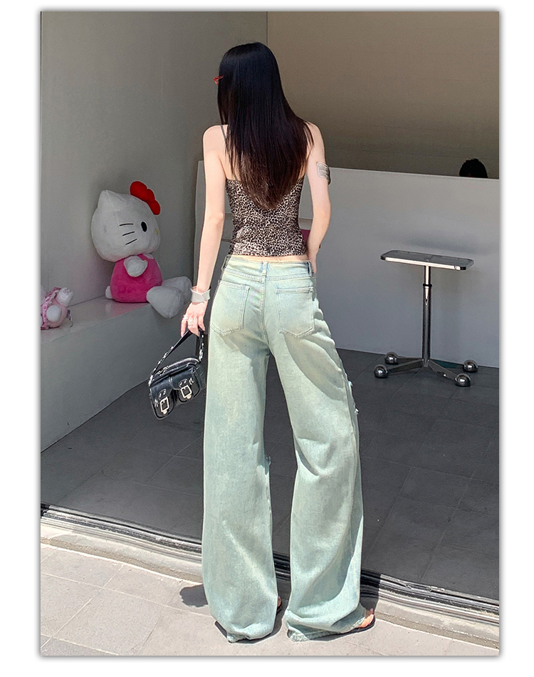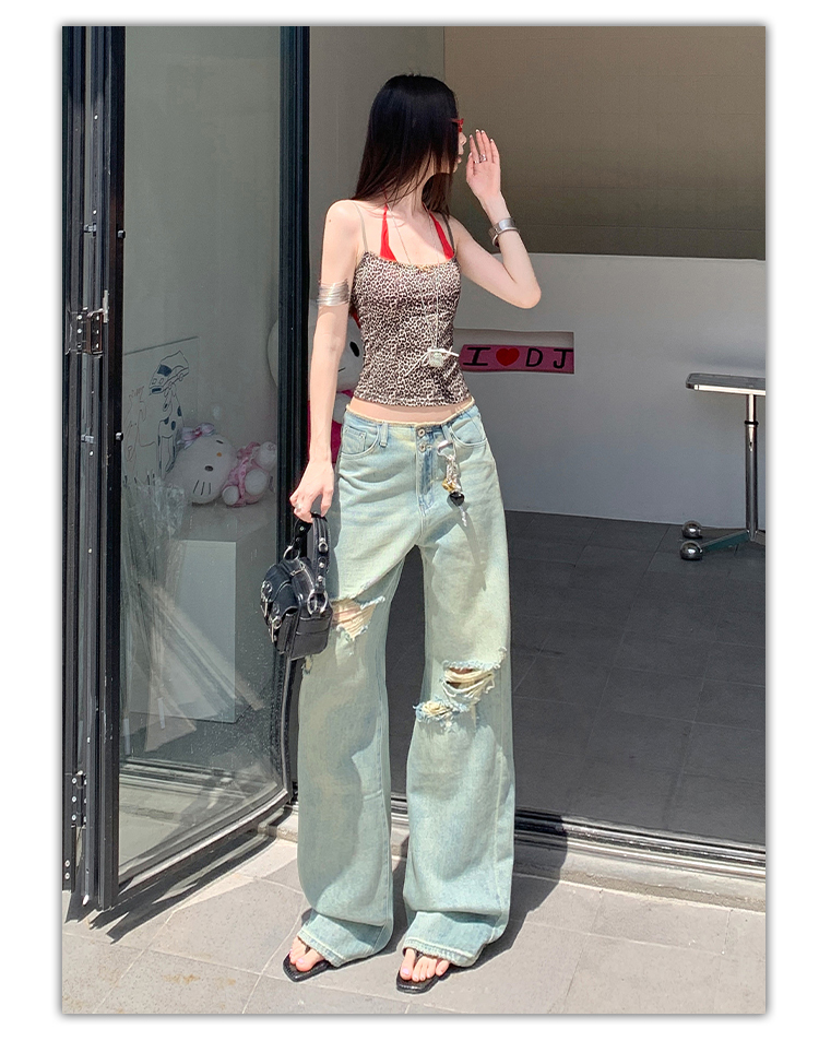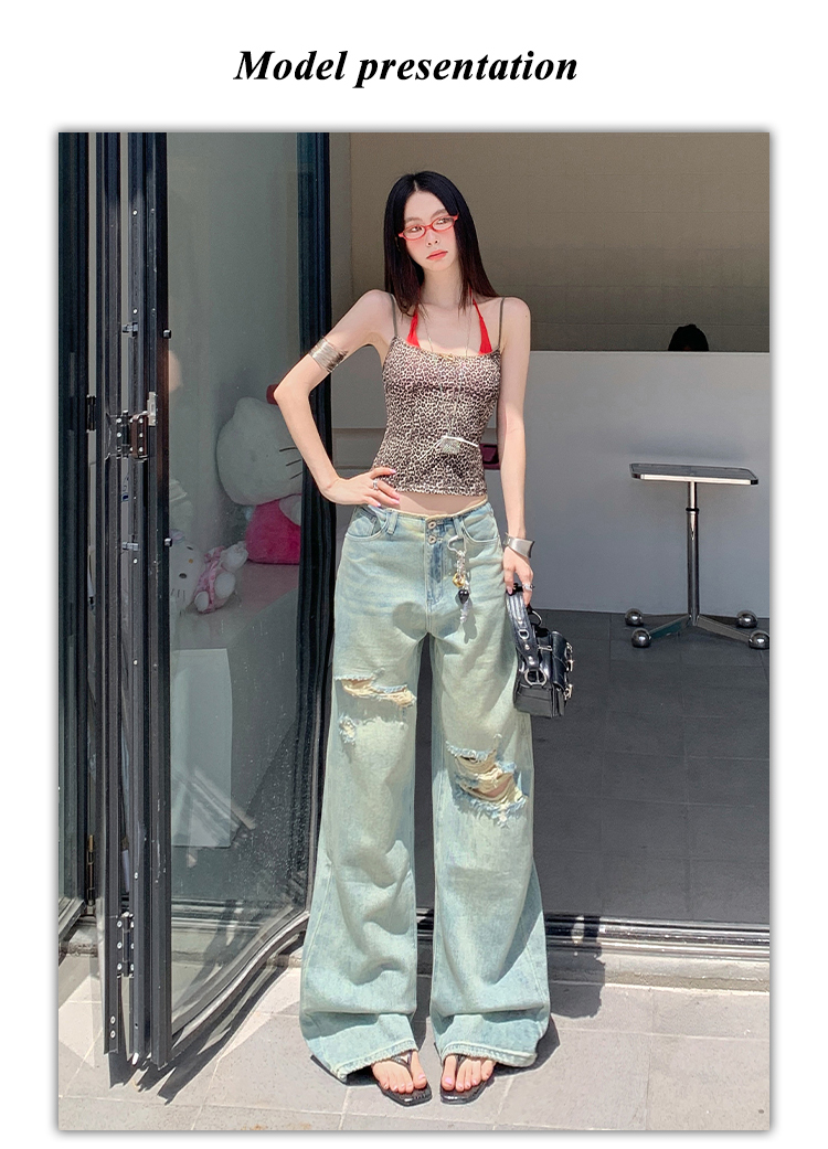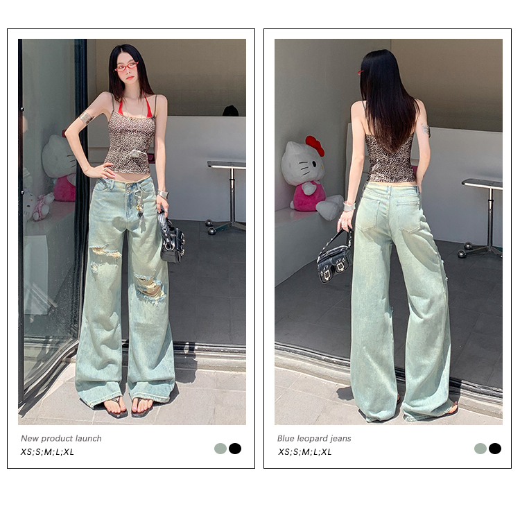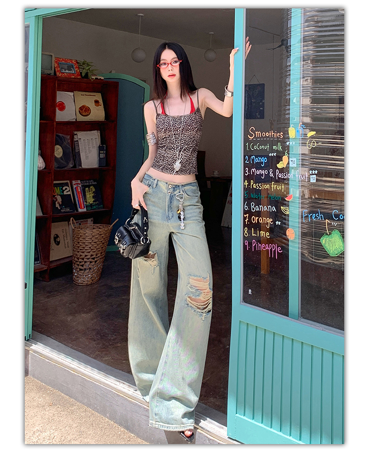 2026春夏新款街头双纽扣破洞水洗做旧宽松直筒阔腿牛仔裤