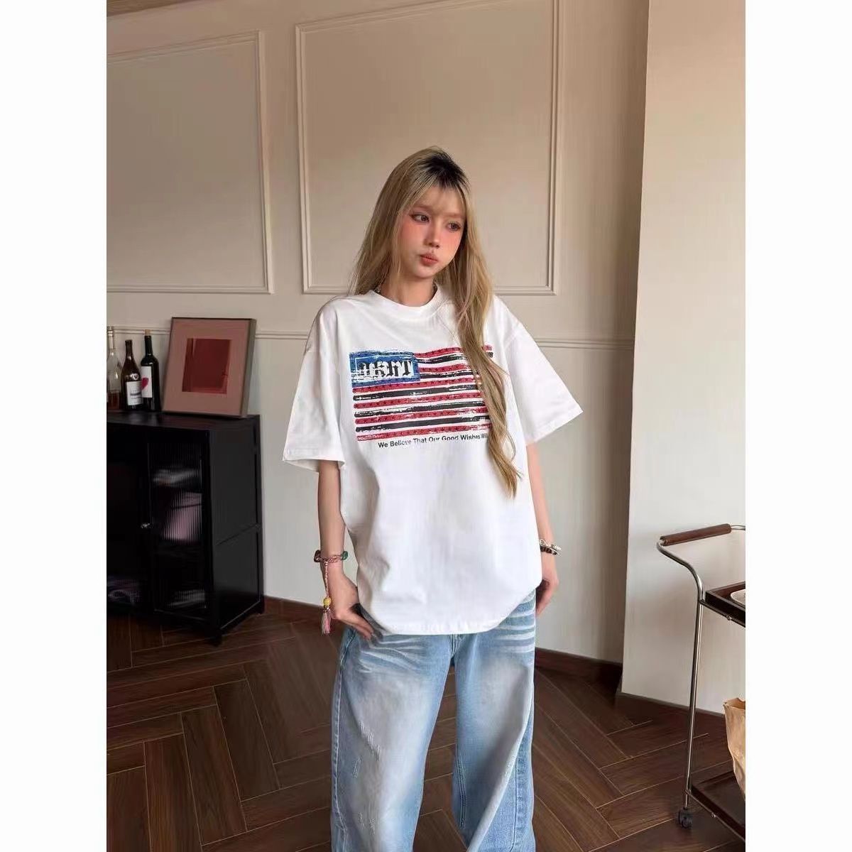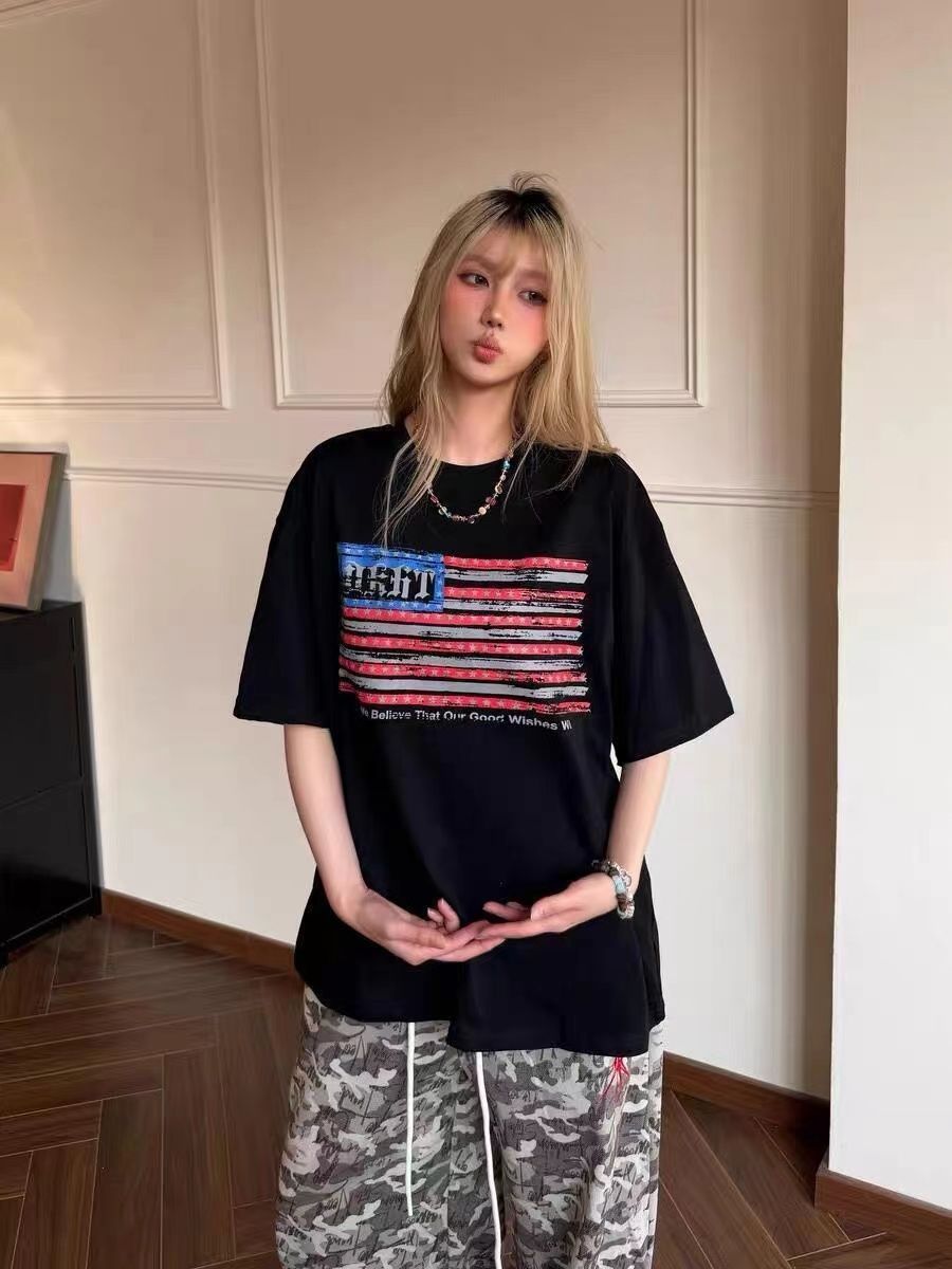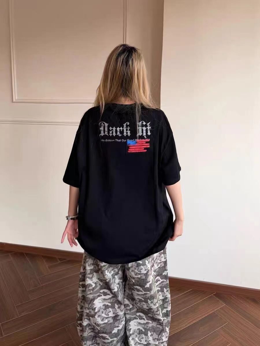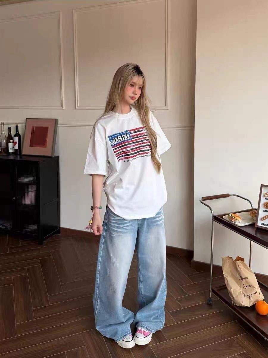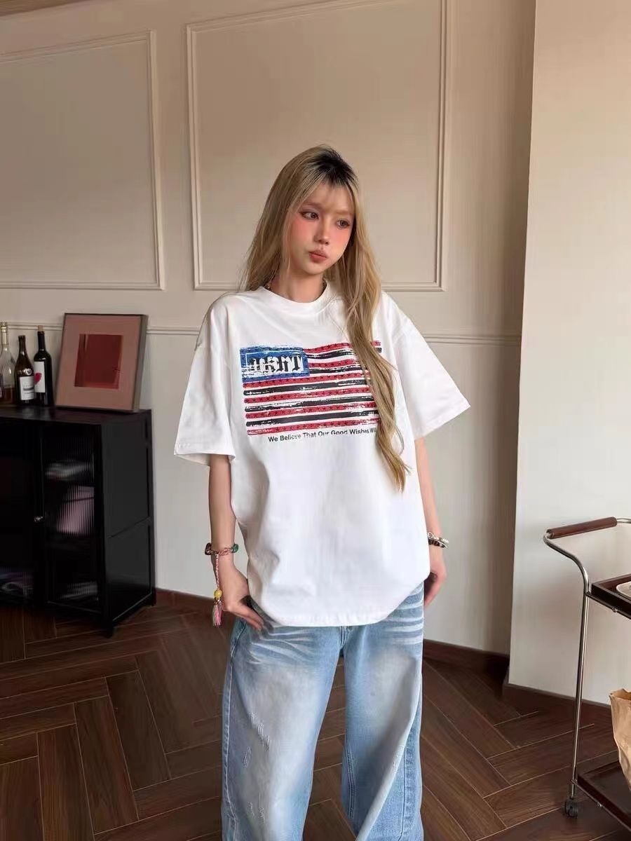 220克纯棉 印花 #短袖t恤女夏季宽松美式高街白色上衣潮