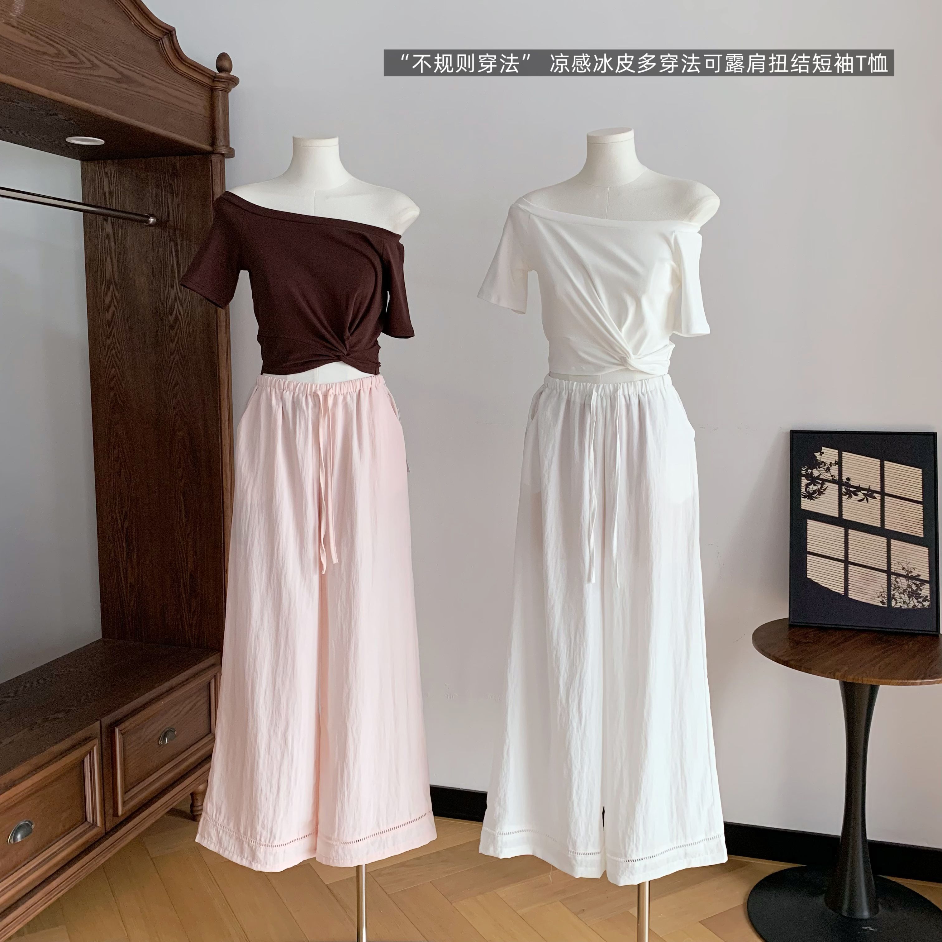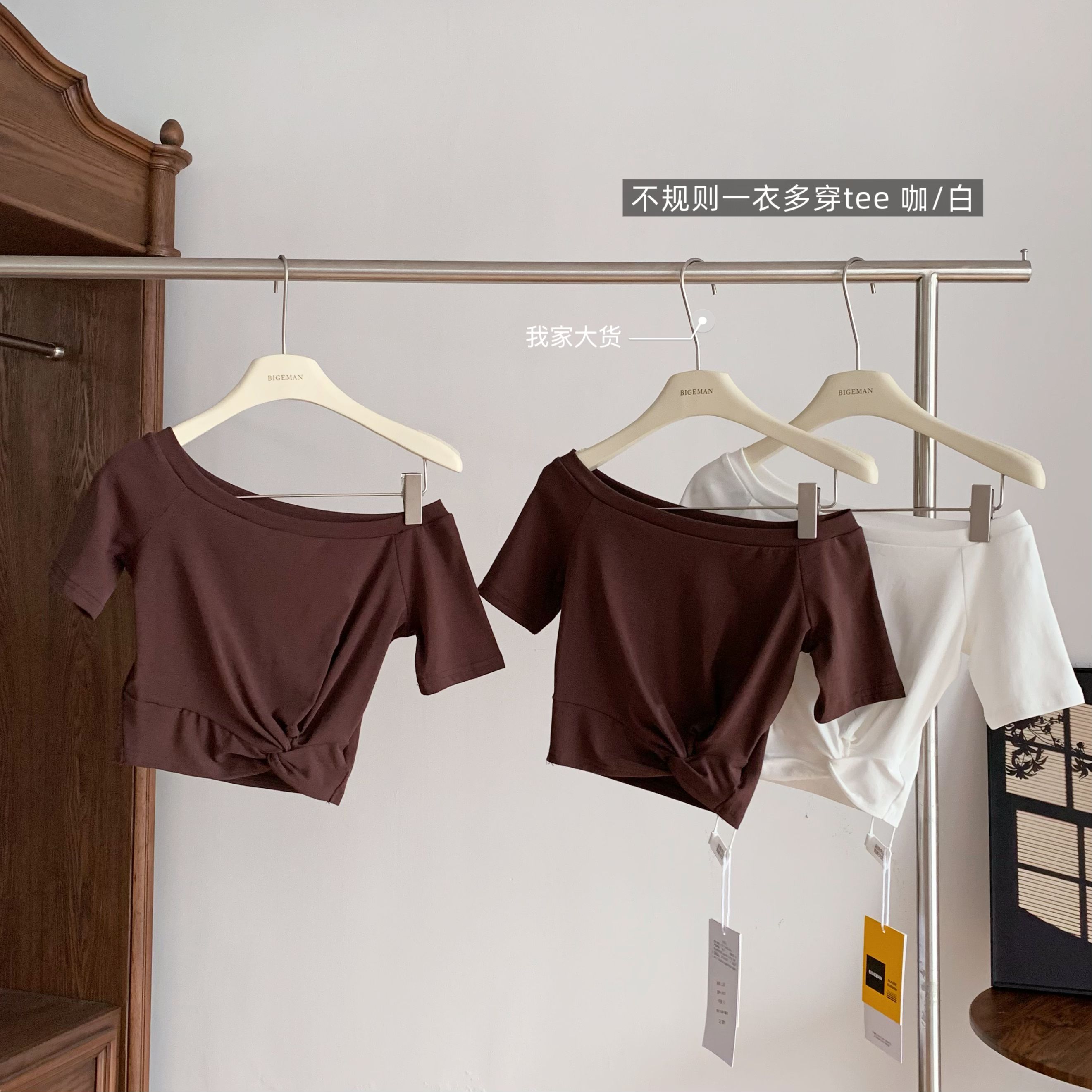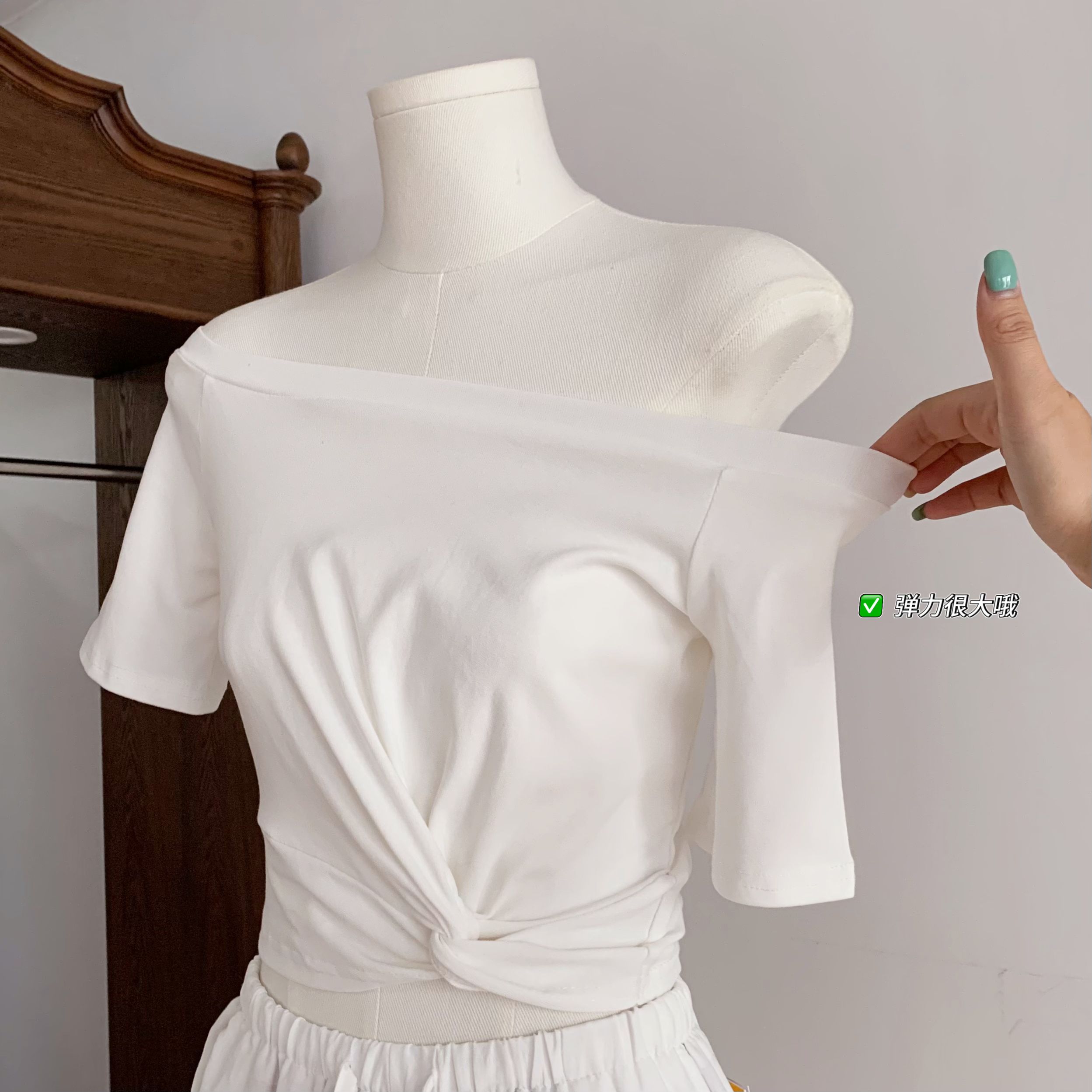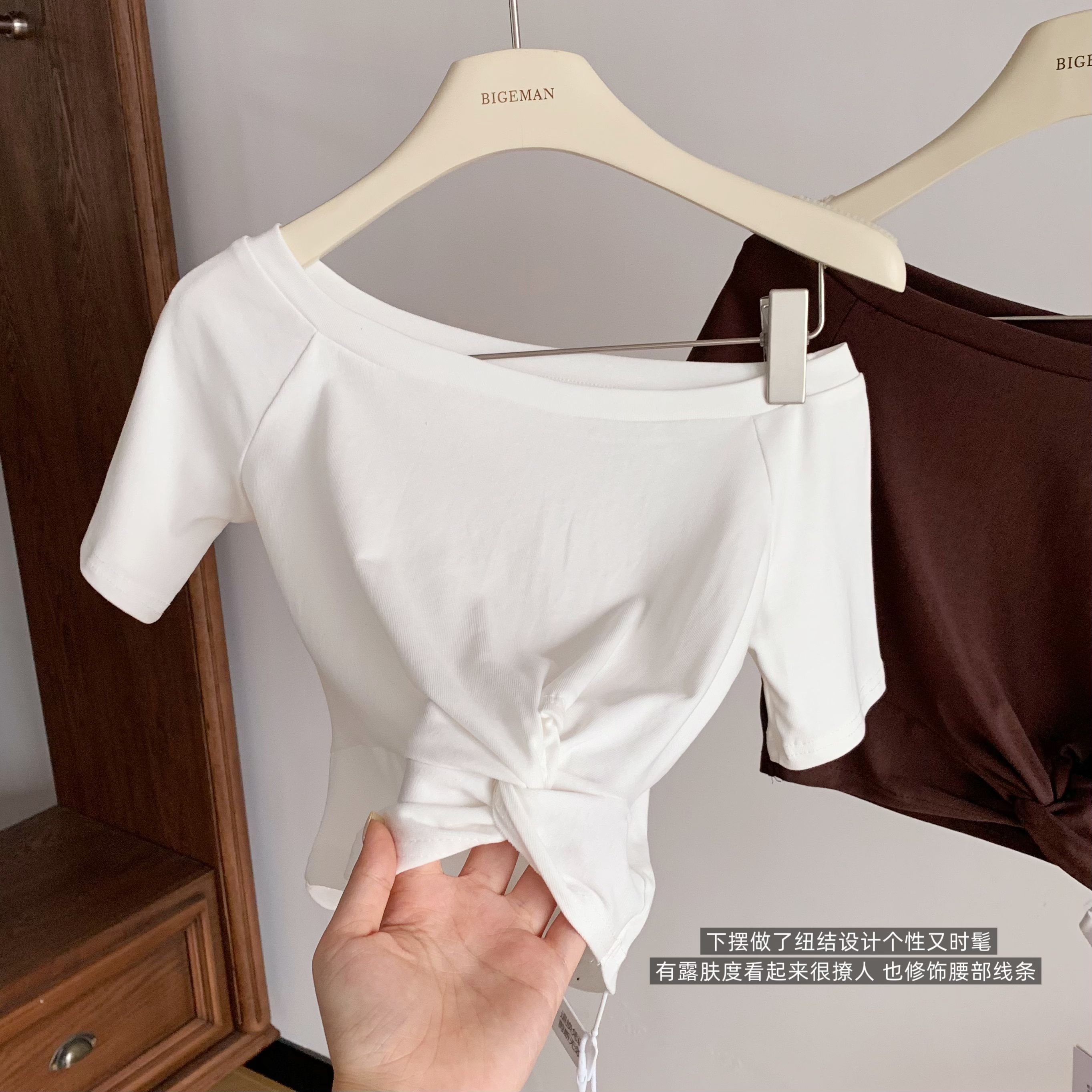 韩雨嘉“不规则穿法” 凉感冰皮多穿法可露肩扭结短袖T恤
