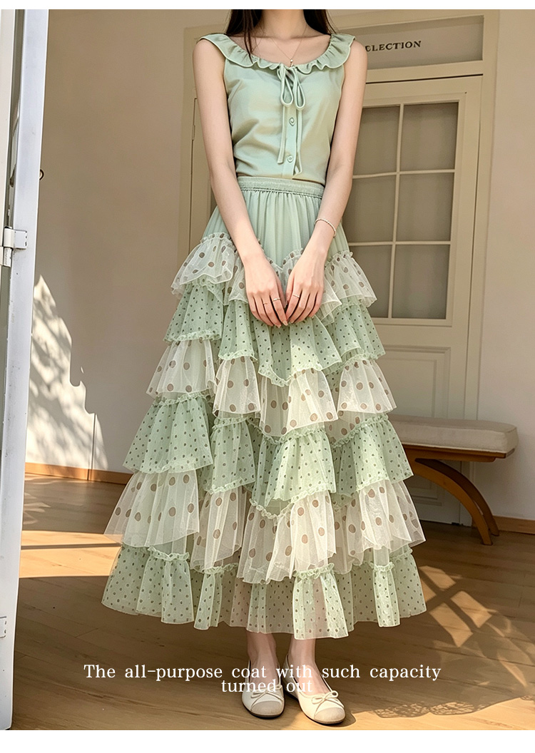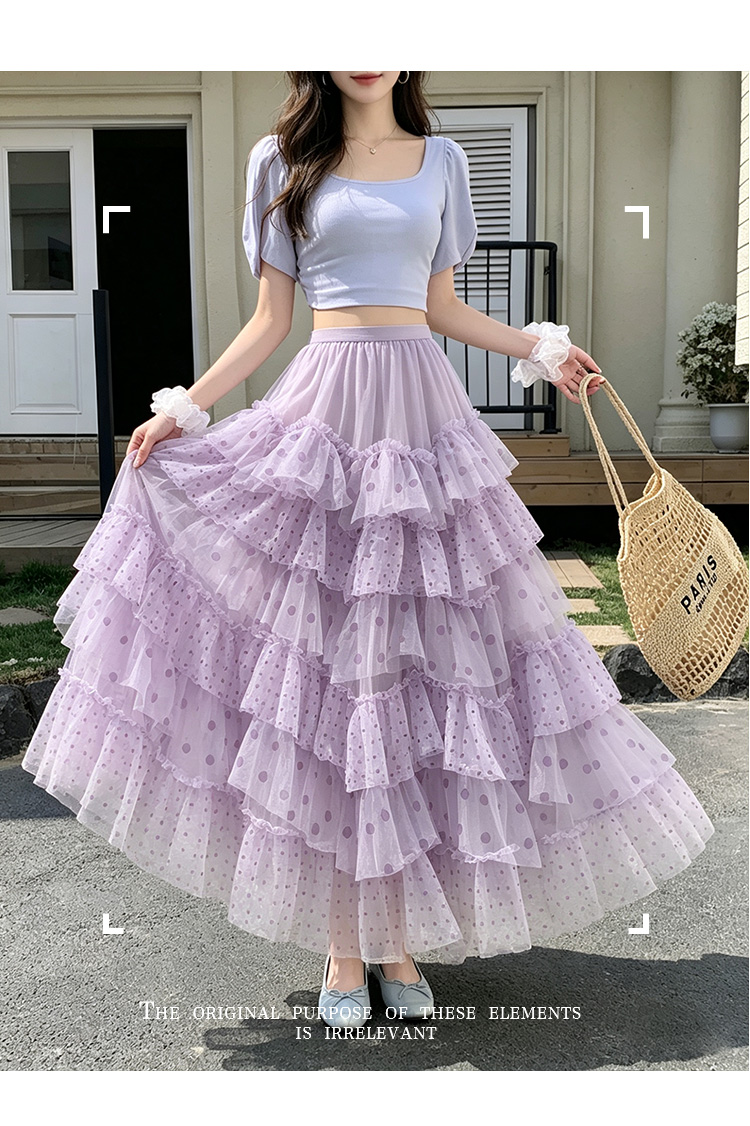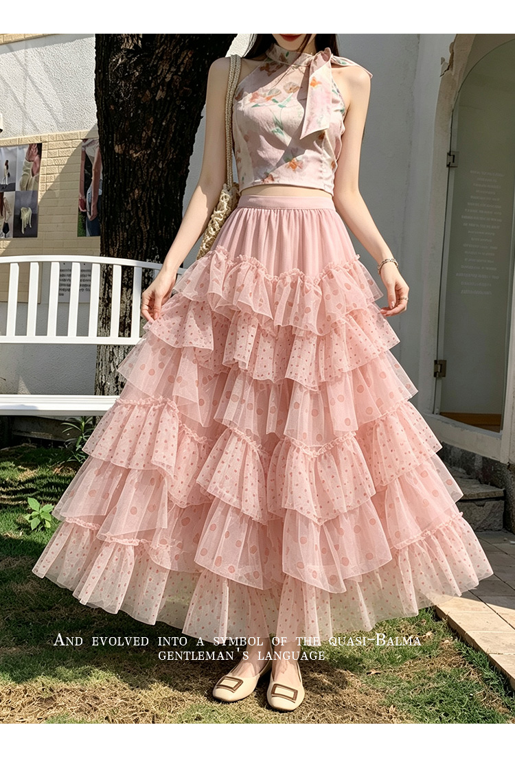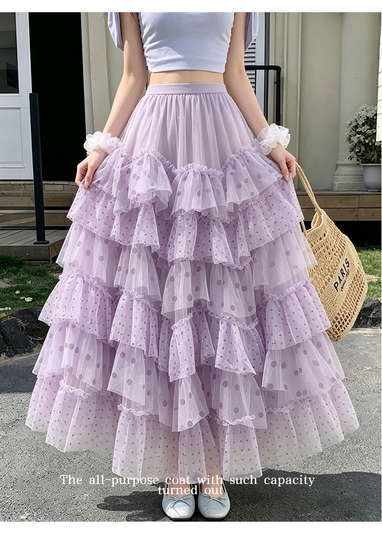 重工拼接波点网纱蛋糕裙半身裙女夏季新款显瘦裙子长裙半裙伞裙子