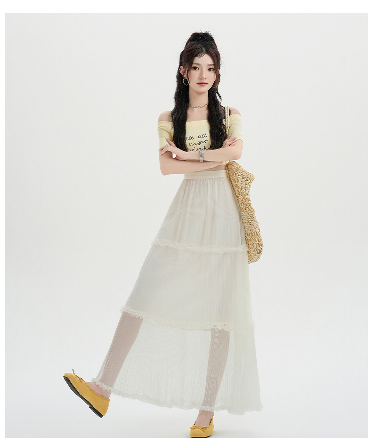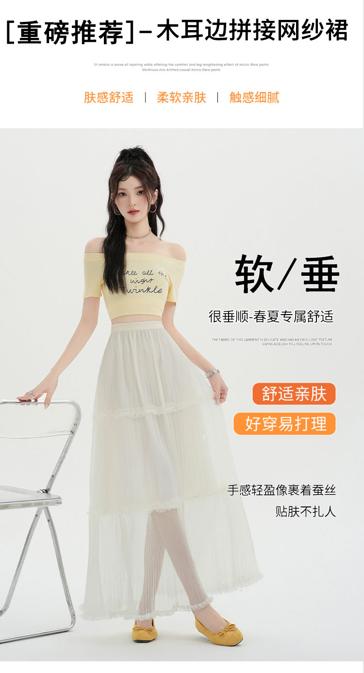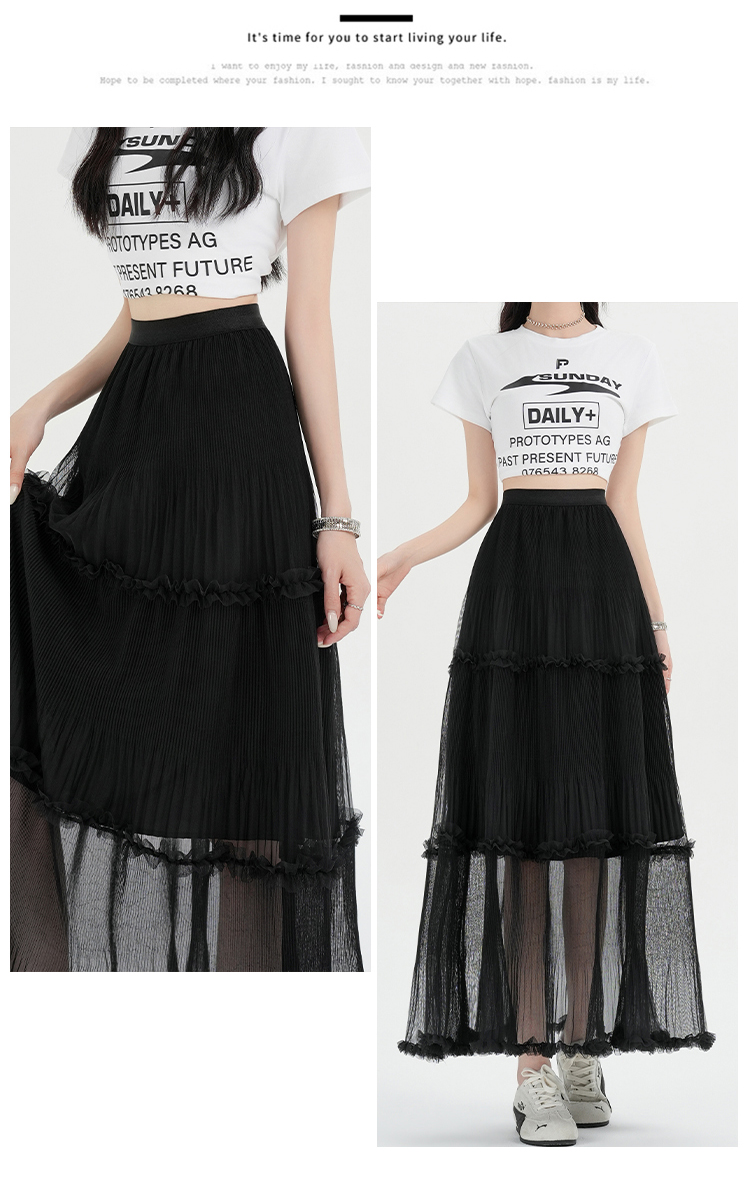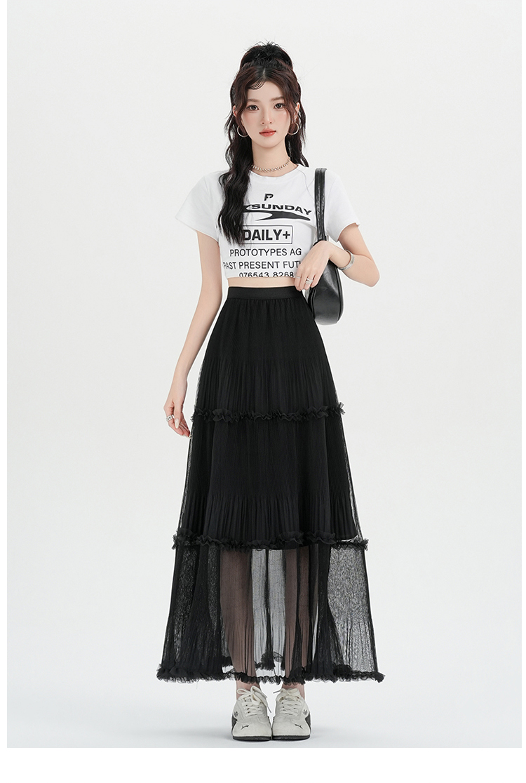 夏季新款a字高腰网纱花边半身裙百褶花边中长款裙子蛋糕蓬蓬裙女