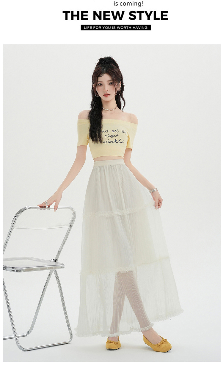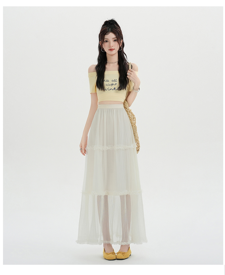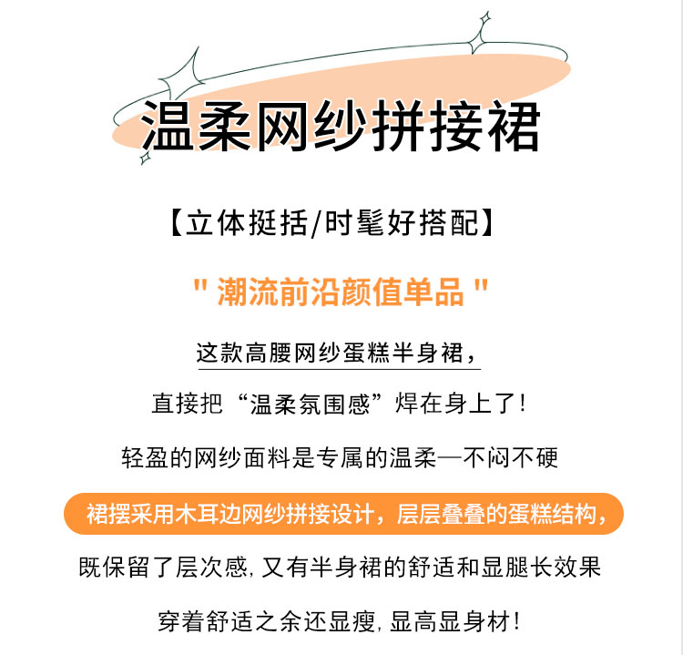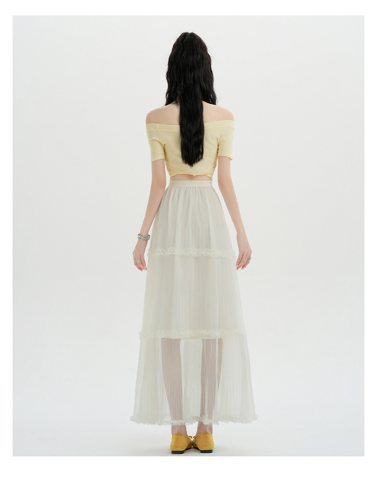 夏季新款a字高腰网纱花边半身裙百褶花边中长款裙子蛋糕蓬蓬裙女