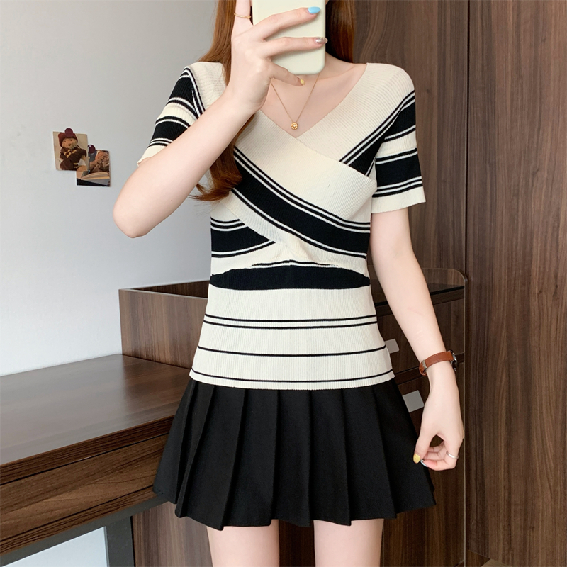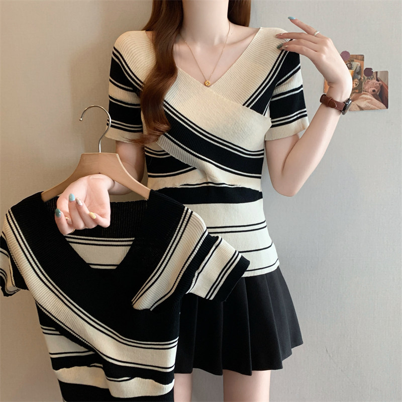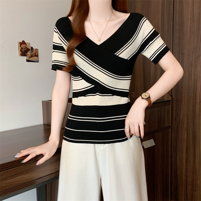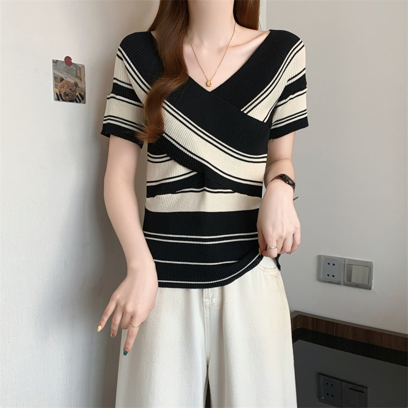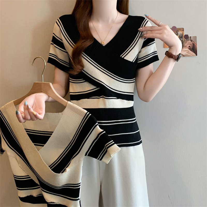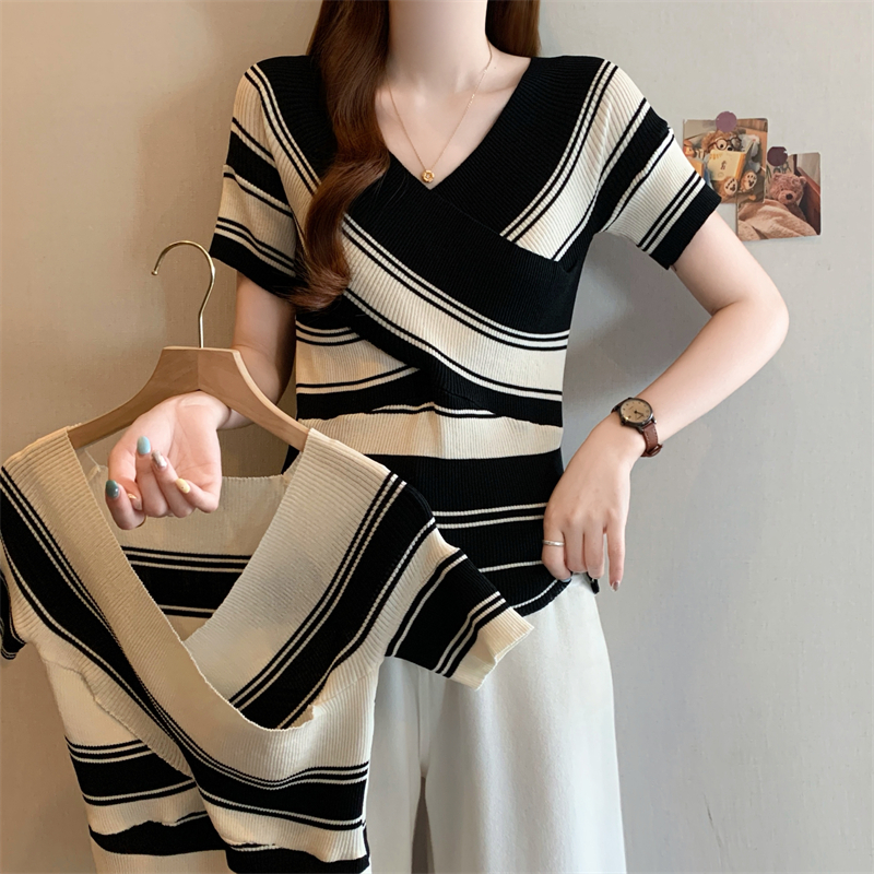 实拍大码撞色条纹针织短袖上衣女胖MM设计感独特V领百搭显瘦T恤